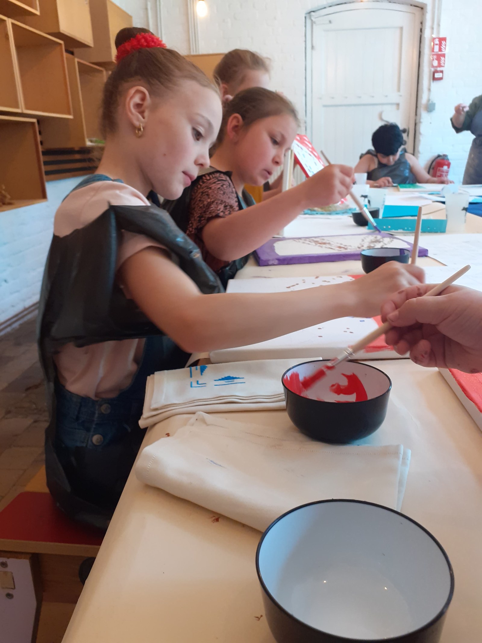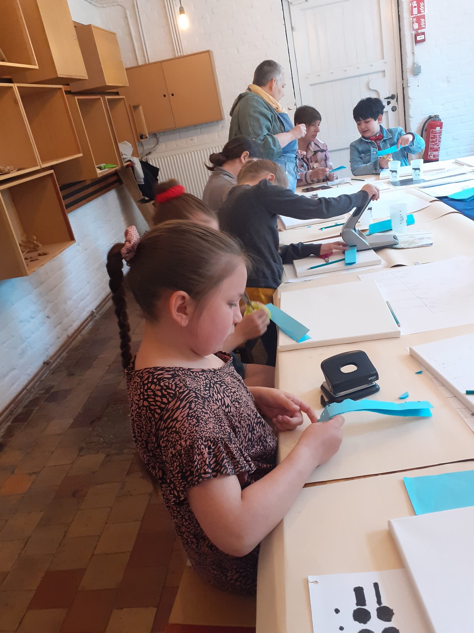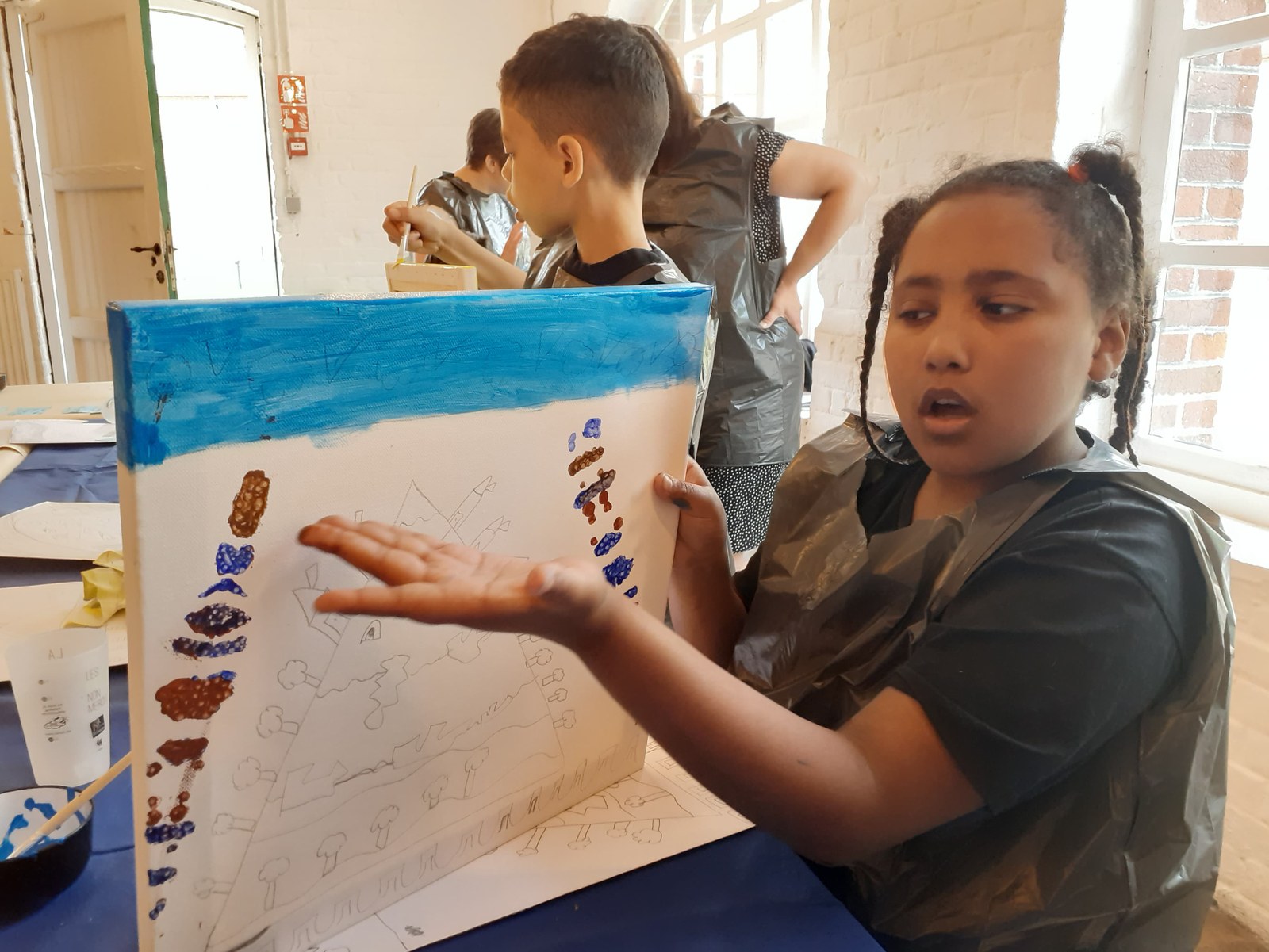 Installés dans le petit atelier pédagogique, les enfants sont étonnamment calmes et patients. L’environnement de bois upcyclé et de cocon à leur taille y serait-il pour quelque chose ? Françoise, l’animatrice, explique étape par étape la façon dont on va procéder. C’est très lent et posé et cela semble leur convenir. D’abord, dessiner l’esquisse sur papier – il faut au moins un terril, peut-être des maisons et un site industriel. Ensuite, la reproduire sur sa toile, que l’on a choisie carrée ou rectangulaire, sans trop appuyer sur la mine de crayon. Pas si simple que cela et certains y réussissent mieux que d’autres. Place à la peinture proprement dite. Pour le fond, il s’agit d’ »imiter » les circuits imprimés qui sont la marque de fabrique de Daniel Pelletti : on plie en deux des papiers, on coupe au milieu et on déplie, comme quand on faisait des petits napperons de dentelle. On utilise la perforatrice pour parsemer son pochoir de trous. Ensuite, on emballe tout le monde dans des sacs poubelle pour préserver les vêtements des taches d’acrylique. Le pochoir bien placé sur la toile – droit, de travers, en bas, en haut : comme on le souhaite -, on applique la peinture avec des cotons tige, certains la sèchent en tamponnant avec une éponge.