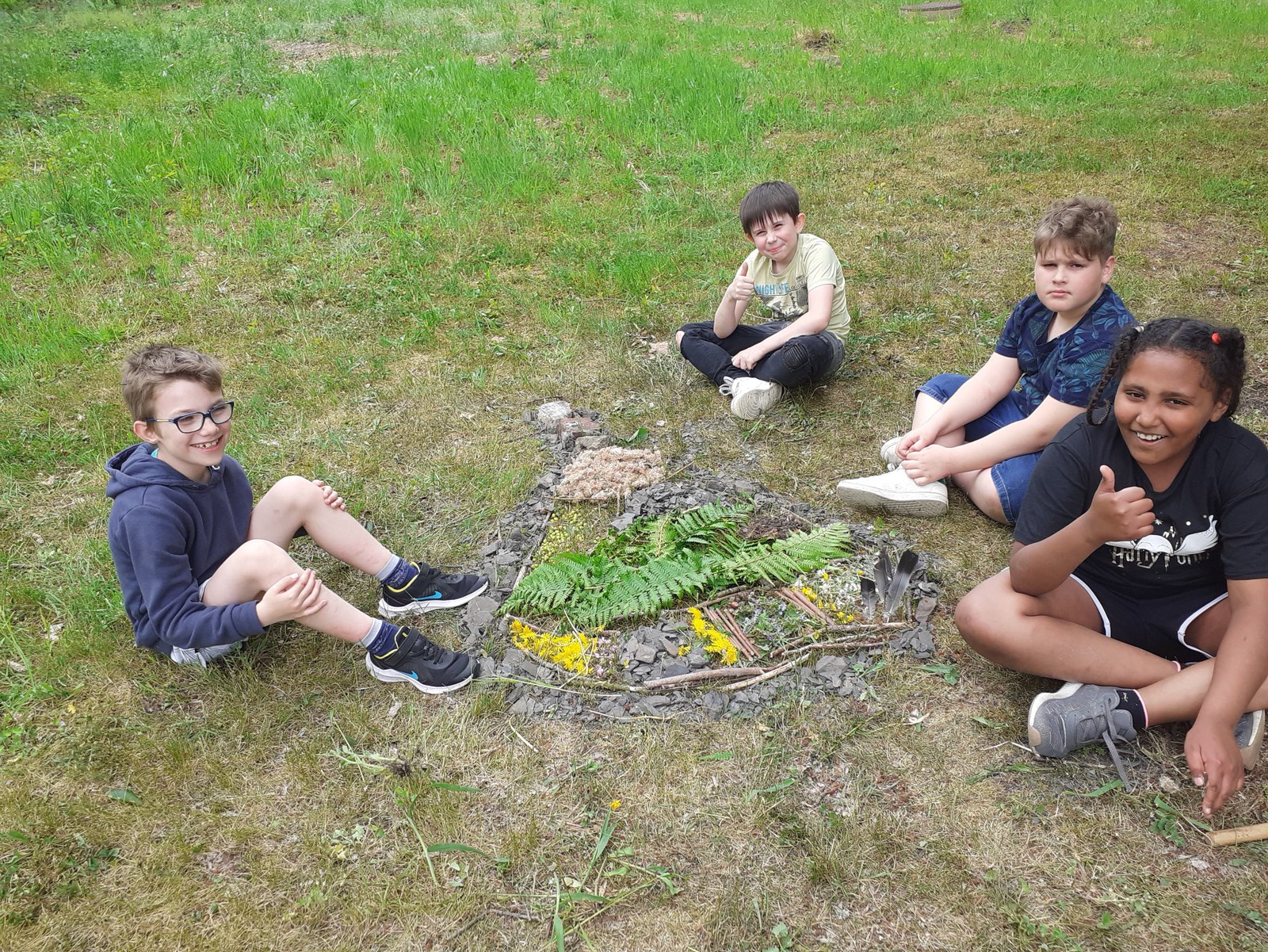 Après-midi, Françoise explique ce qu’est le land art : faire de l’art avec les éléments de la nature. Ici, bien sûr, on va essayer de représenter un terril ! Quelques règles pour collecter sans abîmer, et c’est parti ! En ce mois de mai, il y a vraiment beaucoup d’éléments intéressants : le jaune des boutons d’or et des pissenlits, le vert des cerises pas mûres (on a pu couper la branche parce qu’elle gênait), et de hautes herbes, le bleu des myosotis. Beaucoup de petit bois mort et le schiste rapporté du terril. On dirait que certains préfèrent la collecte que la création patiente de l’œuvre. Il faut travailler en équipe : le collectif est plus difficile que la création personnelle d’une œuvre. Les enfants se disputent un peu, il y a les meneurs, ceux qui ne se sentent pas écoutés, ceux qui rapportent beaucoup de choses mais ne prennent pas le temps de bien les disposer. Zakary ne prend que les chatons, Philippe va au-delà des limites données et revient les jambes remplies de piqûres d’orties. Et pourtant, ils continuent à tous retourner dans cette zone : l’appel du large !