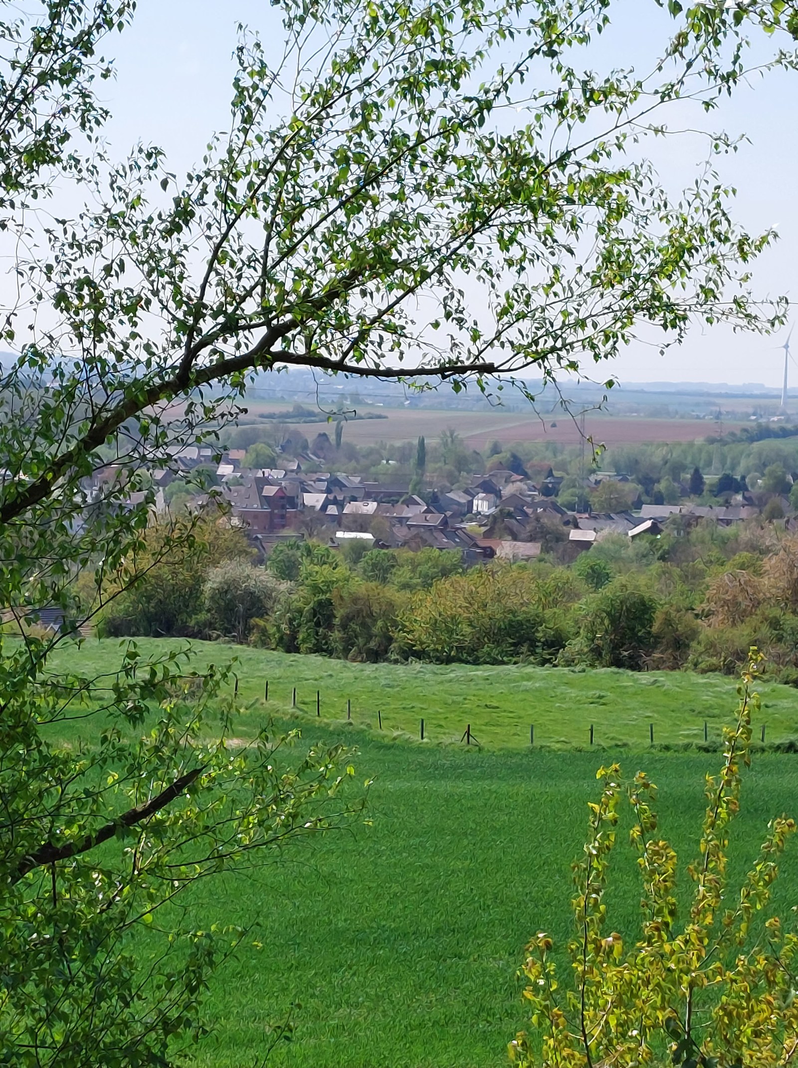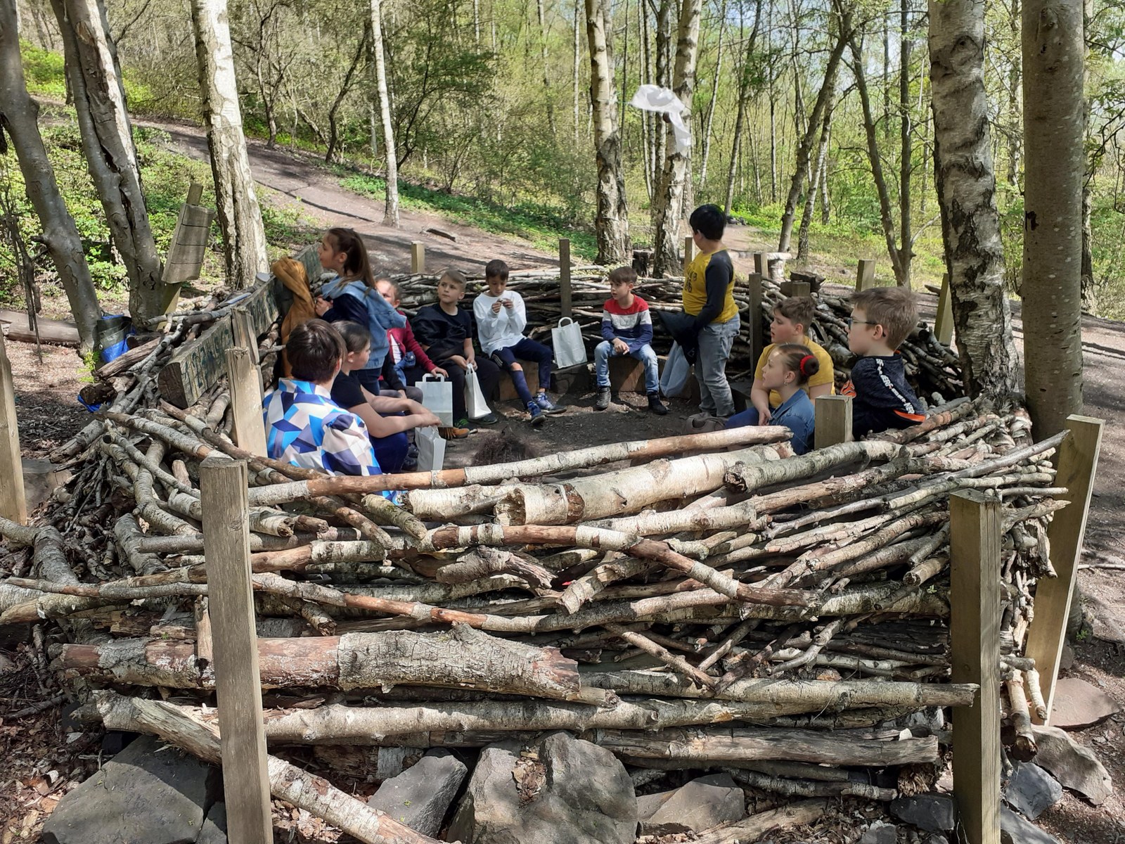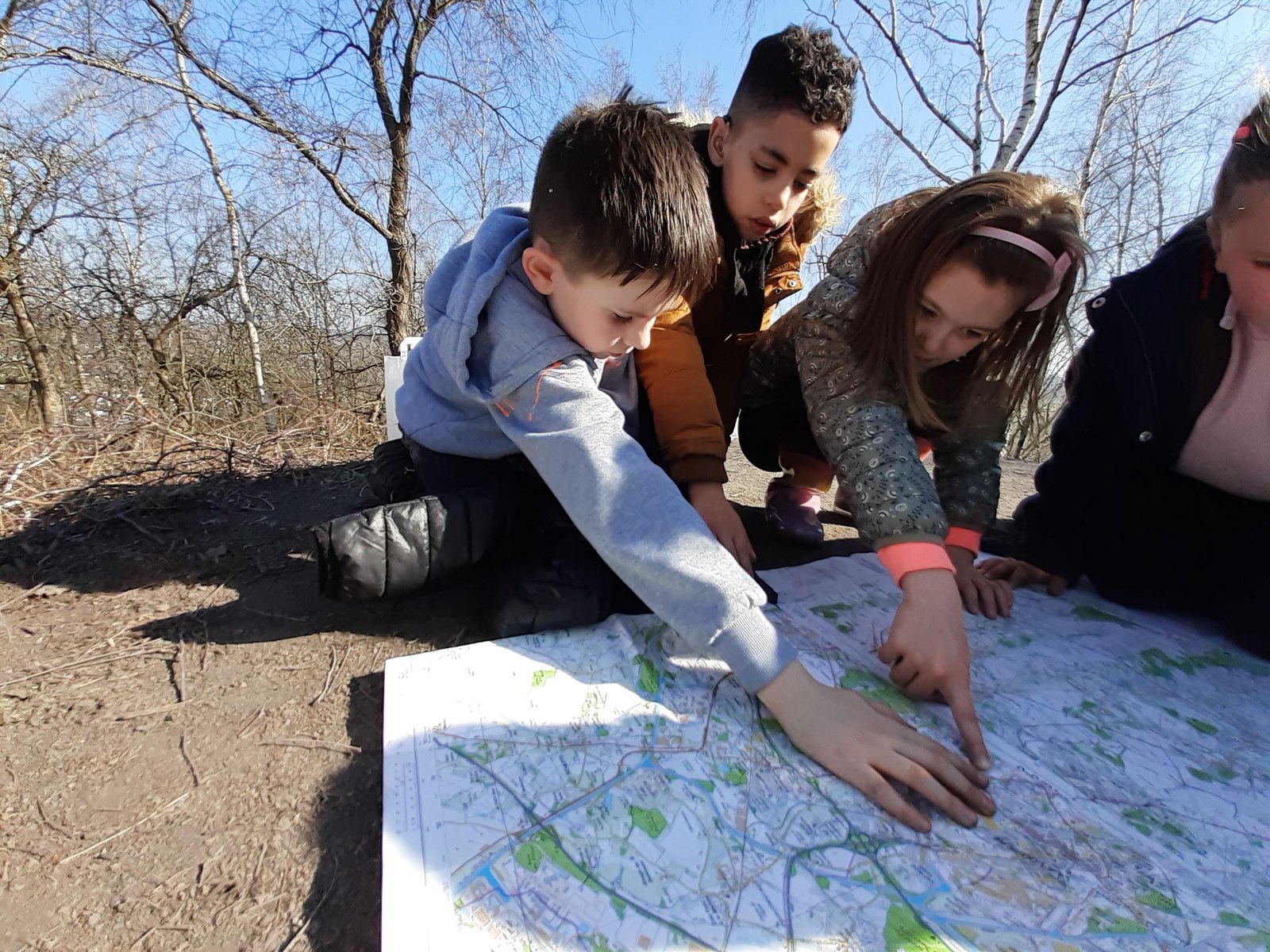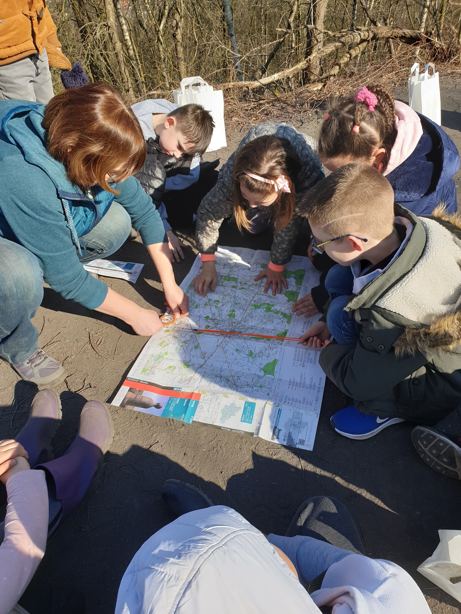 Après-midi, c’est sur le terrain que les petits explorateurs vont s’exercer à l’orientation ! On n’emporte plus que les cartes IGN - celle de La Louvière et celle de Binche, puisque le terril Albert 1er est juste à la jonction des deux – et on fait une première halte « orientation » au château d’eau. Pas facile de se repérer ! On monte ensuite jusqu’au belvédère pour observer enfin le paysage caché par le brouillard lors de notre première montée. On compte les terrils, les éoliennes, on cherche après une voiture blanche, une vache, une église ; on situe l’horizon, l’avant-plan, le plan moyen et l’arrière-plan. On oriente à nouveau les cartes, et on recommencera une dernière fois au sommet. A plusieurs reprises aussi, on ferme les yeux pour écouter les sons autour de nous : la nature est un peu plus réveillée que la première fois : il y a plus d’oiseaux. On entend beaucoup les voitures, mais aussi un avion, le marchand de glace, le vent dans les arbres et la cloche de l’église.