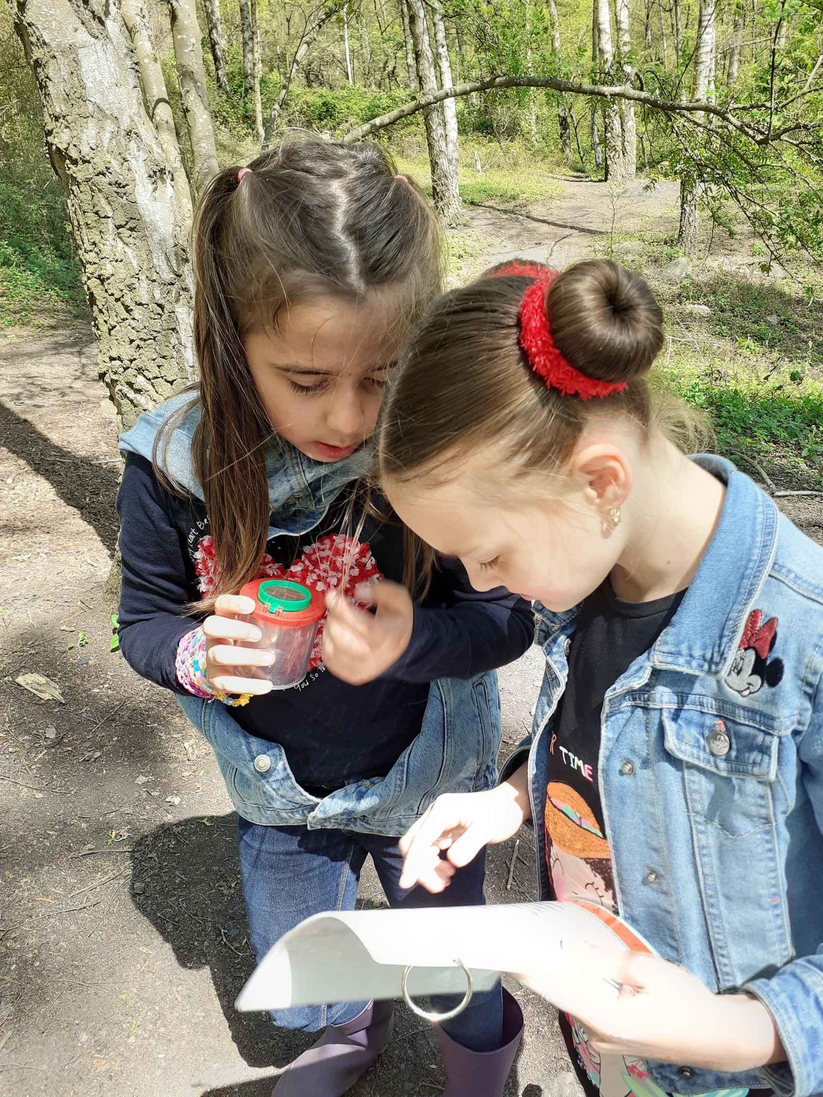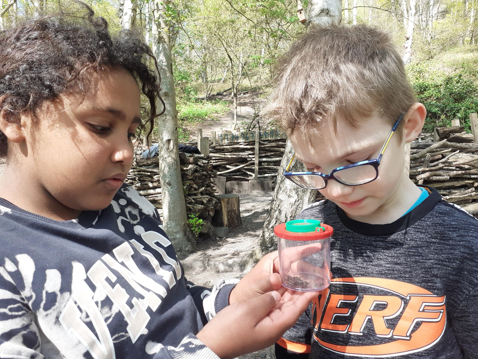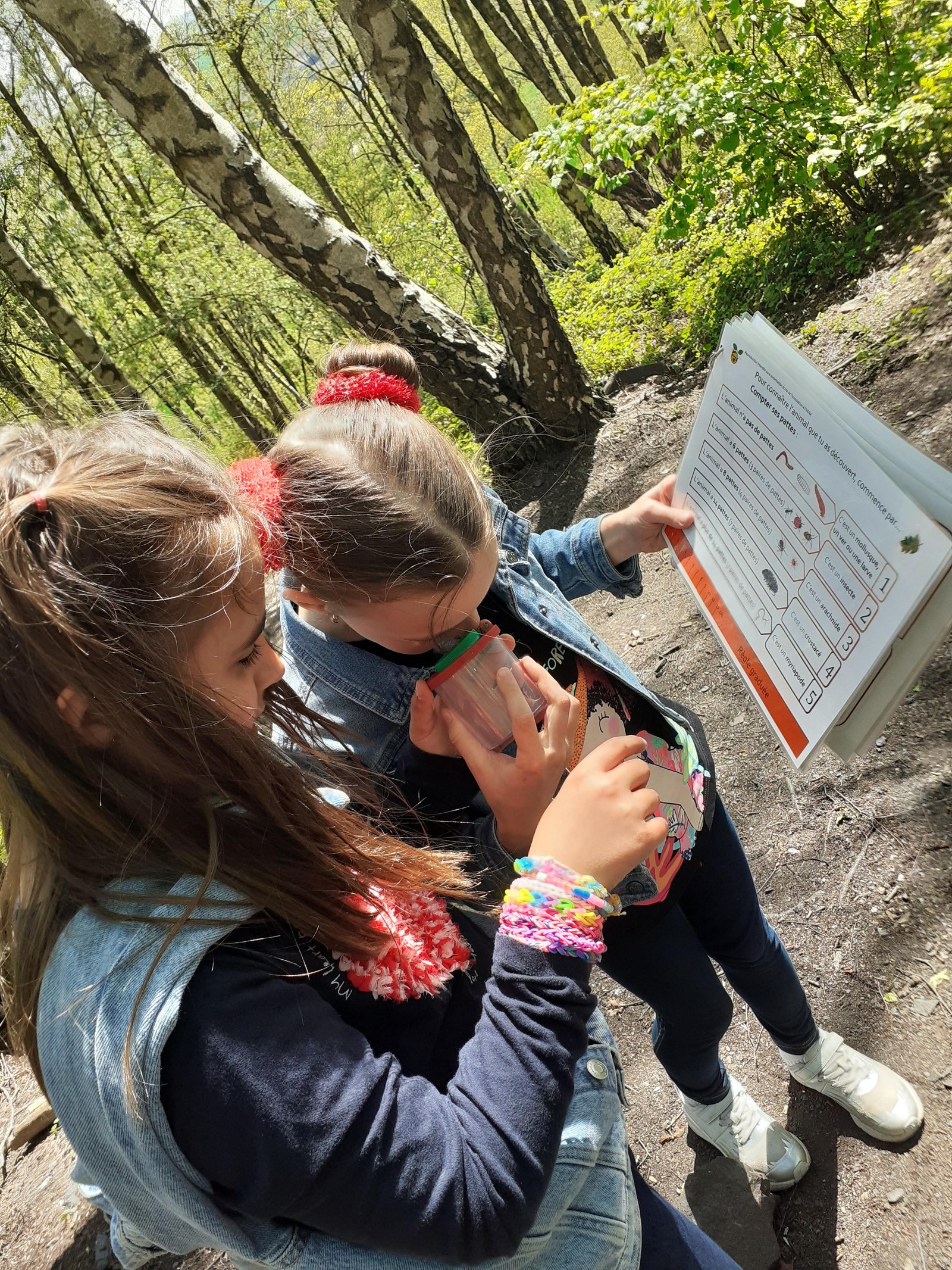 Le printemps est vraiment là ! La végétation est dense. « Avant, y avait pas d’arbre », dit Philippe. « Pas d’arbres ? Vraiment ? Précise un peu ce que tu veux dire… « Il n’y avait pas de feuilles sur les arbres, ils étaient tout nus ! ». On approche le terril par un autre côté que les deux premières fois, histoire de bien observer les changements de loin. Puis on se rapproche, et là, c’est toute une symphonie d’oiseaux qui nous accueillent : on s’en souvient, la première fois, en hiver, on avait à peine entendu deux oiseaux… Quelle joie d’être dans la nature, de pouvoir marcher ou courir à son rythme (enfin presque) ! On prend le chemin à la file indienne, on observe les schistes, le cerisier en fleurs -ce qui nous permet de nous rappeler la façon dont les graines se dispersent. Les oiseaux adorent les cerises !! Maëlyne passe la première et sursaute quand une tourterelle s’échappe d’un buisson à son arrivée : laquelle des deux a fait le plus peur à l’autre ? On se rend compte qu’on passe par le versant sud du terril : grâce au soleil et à la végétation. Puis on emprunte un chemin escarpé jusqu’au petit coin aménagé par l’école du dehors : aujourd’hui, c’est à nous de faire l’école dehors ! On s’assied en cercle sur les rondins de bois. Première mission : observer les petites bêtes au sol après les avoir attrapées délicatement et à l’aide de la clé de détermination. On soulève de vieilles souches ou des pierres : quel grouillement !! Beaucoup de cloportes, quelques chenilles qui avancent en se tortillant. Pas facile de compter le nombre de pattes tellement les animaux bougent ! Ensuite, on étale un grand papier blanc au sol et on secoue la branche juste au-dessus : quelques petites bêtes qu’abritait l’arbre y tombent… Philippe a peur des petites bêtes et participe peu à l’activité, même si Maelys essaie de l’entraîner.