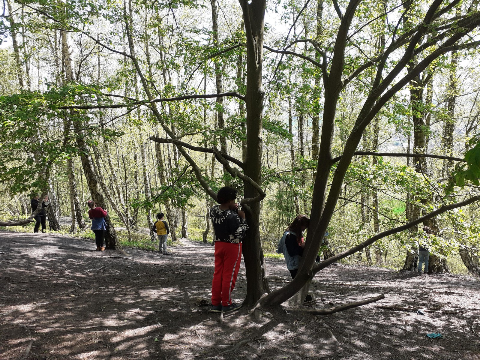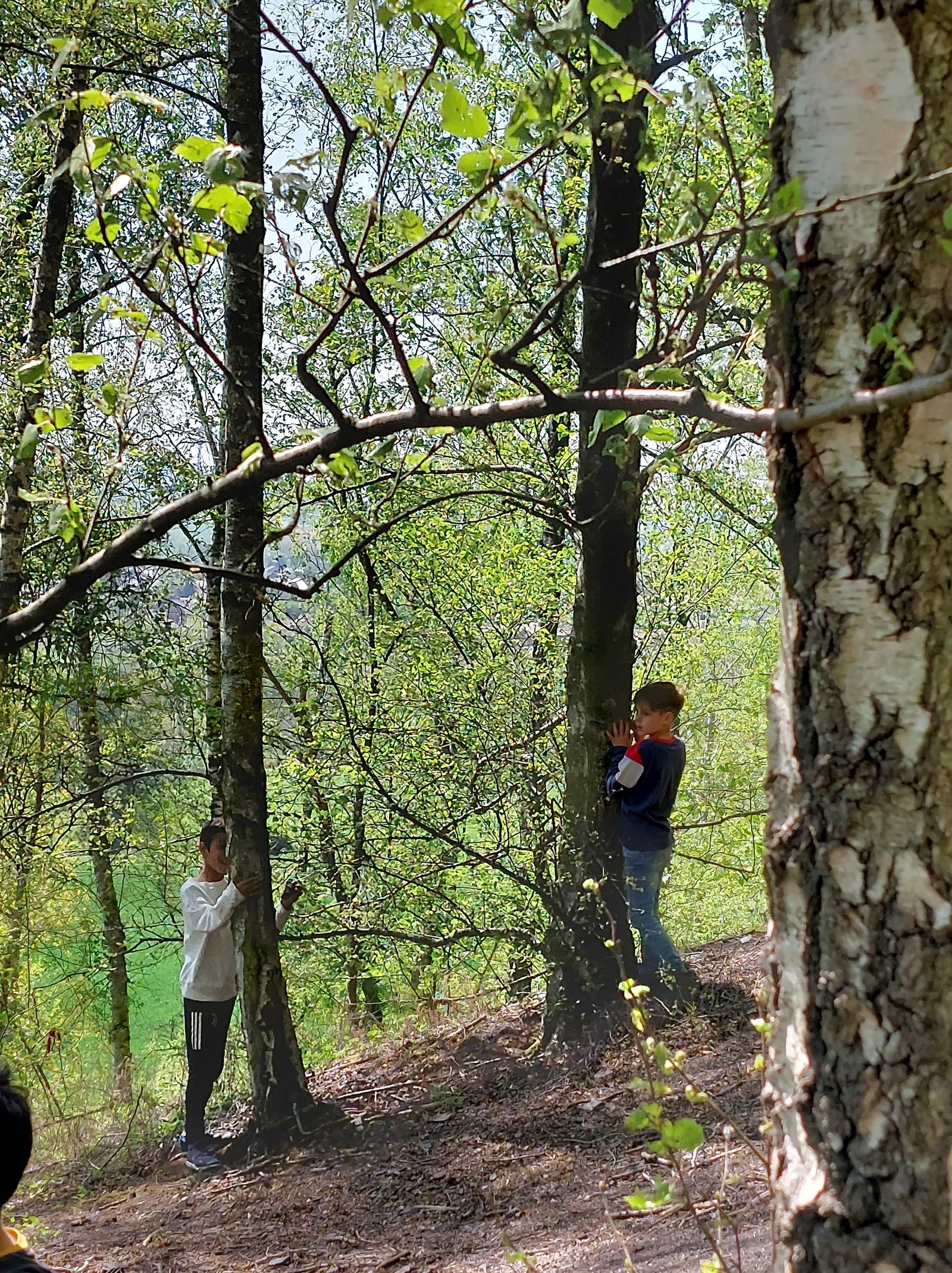Et maintenant, on se recentre : chacun choisit un arbre, l’entoure de ses bras, pose son front contre son écorce, ferme les yeux. Et imagine son histoire. Au début, certains font les clowns… Ce n’est pas dans leurs habitudes de se poser calmement contre un arbre… Je fais semblant de rien, je poursuis mes propositions pour faire voyager leur imagination, et petit à petit tous entrent dans la danse… Au retour, je propose à ceux qui le veulent de raconter l’histoire de leur arbre. Deux candidats seulement. « Je crois que mon arbre est vieux, il aime quand il pleut, car il ne veut pas avoir soif ». « Je crois aussi que mon arbre a au moins 67 ans, mais lui il aime l’été, quand il y a beaucoup de feuilles, qu’il se fait beau ». « Mais il se fait beau pour qui ? « Les autres arbres, les humains qui se promènent ». Peu à peu, d’autres veulent raconter leurs histoires aussi. « Mon arbre a le tronc lisse, il a 8 ans. » « Comme toi ? « « Oui, il abrite des oiseaux et des petites bêtes ». « Mon arbre a trop de mousse, il voudrait une saison où il n’y a pas de mousse ». Alessio rigole en disant qu’il a une histoire ; il a sans doute peur qu’on se moque de lui, c’est quoi ces histoires d’arbres qui ont une vie ?? Son frère rigole aussi et répète la même histoire.