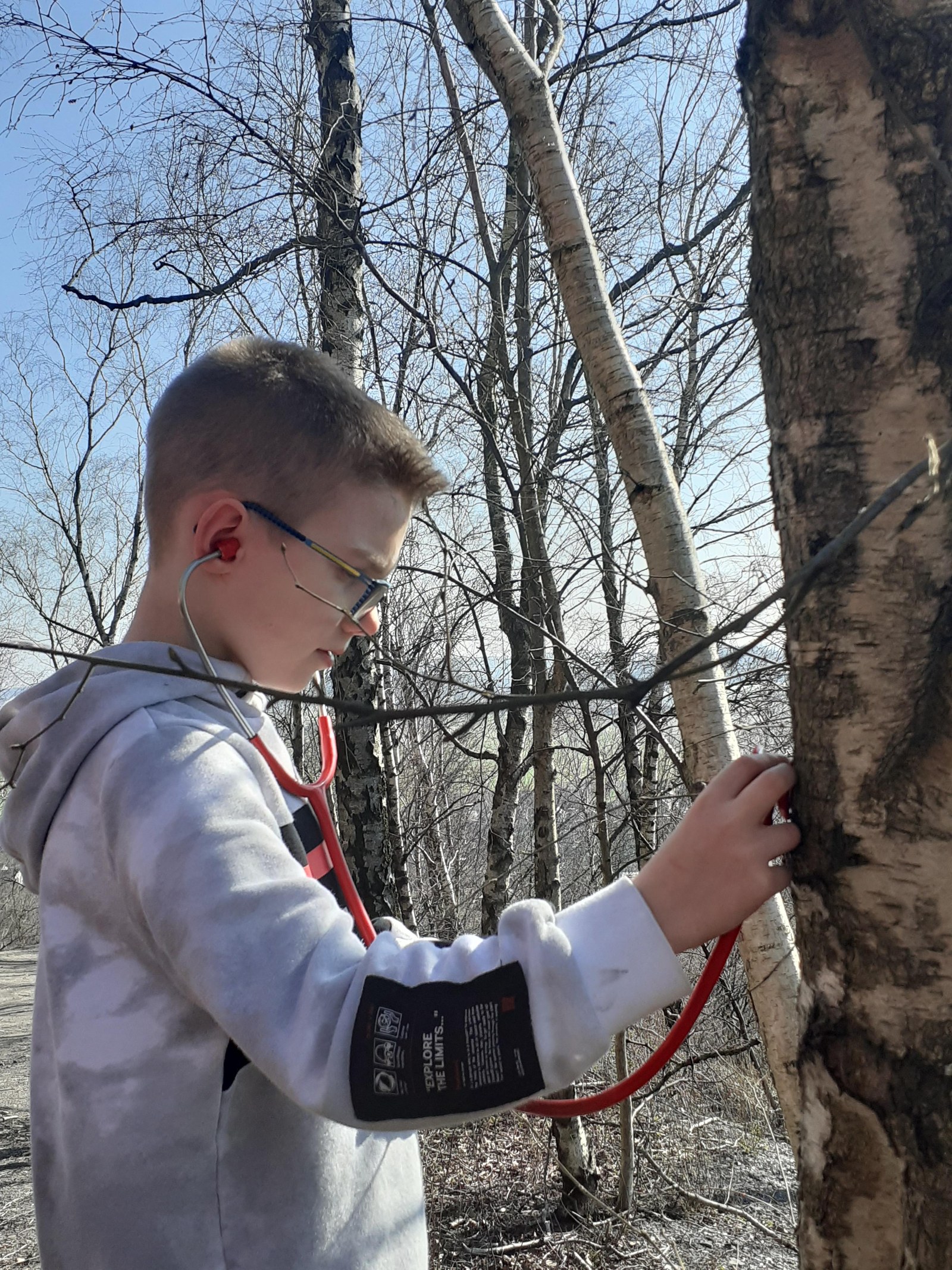 Surprise : on va jouer au docteur ! On va ausculter le tronc d’un bouleau avec un stéthoscope pour essayer d’entendre la sève couler. Mais ce n’est pas évident… Il y en a même un qui entend un aigle ; et le voilà parti au pays des Indiens.