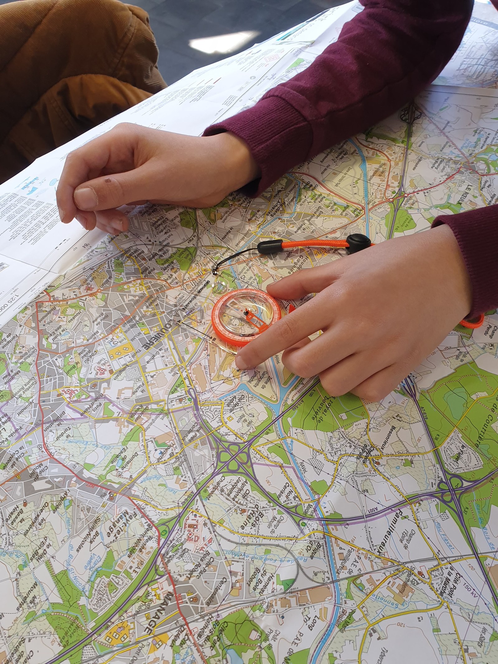 Ce matin, on a découvert en classe comment trouver son chemin : à l’aide d’un gps quand on part en voiture avec les parents (eh non, un gps, ce n’est pas de la magie : quand il nous montre le chemin, c’est grâce aux satellites ! ). « Dans la voiture de ma tante, il n’y a pas de gps, alors on prend une carte ! » Chaque groupe reçoit un type de carte différent : carte routière, carte topographique, plan de ville ; chacune a son utilité. On repère l’école : le plus facile est de trouver un indice qui peut nous aider. L’église en face de l’école, ce sera parfait : il suffit de chercher une croix ! Puis on trouve les « carrés de Bois-du-Luc ». Le dessus de la carte étant toujours au Nord, on tourne les cartes jusqu’à trouver la bonne orientation, puis on vérifie avec les boussoles !