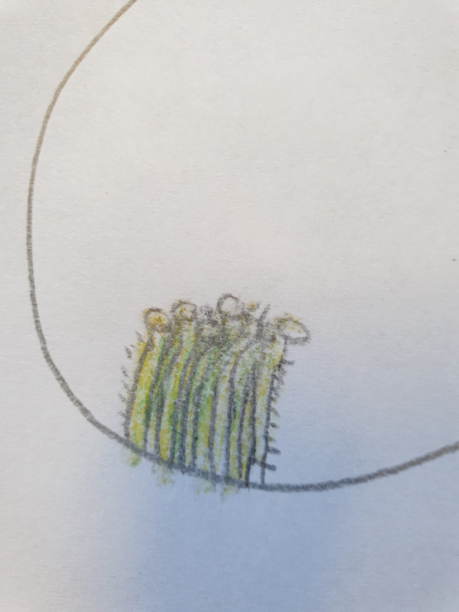Puis on a récolté des éléments pour pouvoir les observer au microscope : pierres avec ou sans fossiles, feuilles lisses ou piquantes, fruits murs ou pourris, boules qui s’accrochent et bogues, plumes, et une drôle de chose en forme d’étoile : c’est un champignon typique du terril, une astrée.
