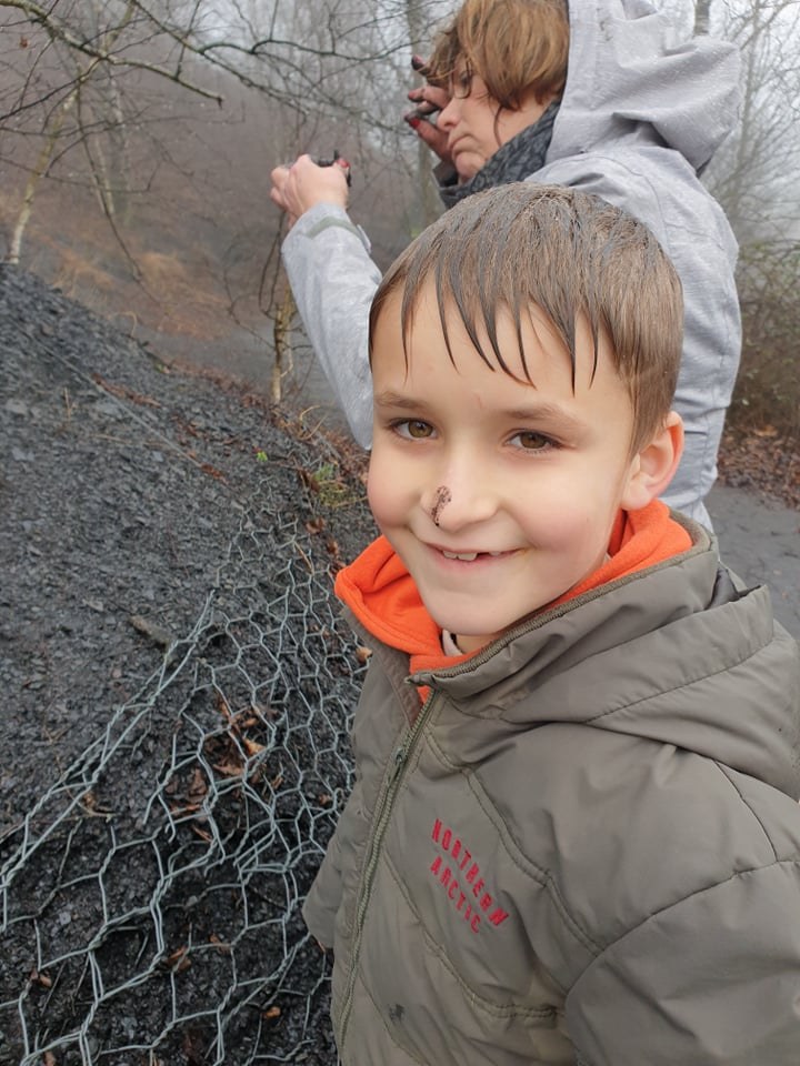 En haut du terril, on a parlé de la nature en hiver. La nature est au repos. Il n’y a presque pas de feuilles. On s’est tu, on a fermé les yeux et ouvert grand les oreilles, et on a entendu peu de sons dans la nature : 4. On les a imités : le bruit des voitures, le vent, un chant d’oiseau et un autre, Une mésange et une corneille. Il y avait des moustiques qui tournaient autour de nous, bizarre en plein hiver.
