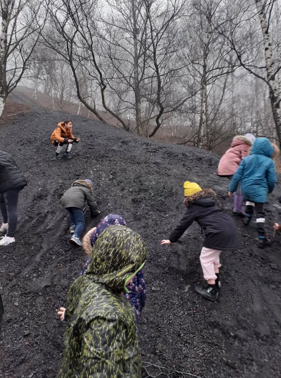 Il pleut. Il a fait beau en début de semaine, et voilà qu’aujourd’hui, parce qu’il faut monter sur le terril, il pleut à verse ! Heureusement, ça n’a pas trop l’air d’effrayer les enfants. Ils ont chaussé leurs vieilles baskets ou leurs bottes, enfilé des vêtements qu’ils peuvent salir, et c’est parti ! Brouhaha généralisé !