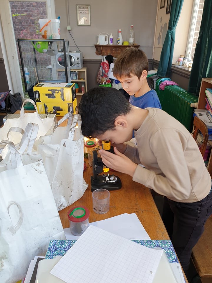 Demain, les enfants dessineront tous les détails d’un élément qu’ils ont collecté dans leur sac et qu’ils observeront au microscope. Puis ils écriront 5 phrases : au terril, j’ai… (cueilli, ramassé, entendu, vu, touché, senti, pleuré, râlé…).