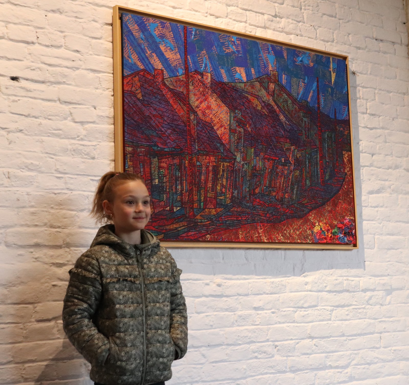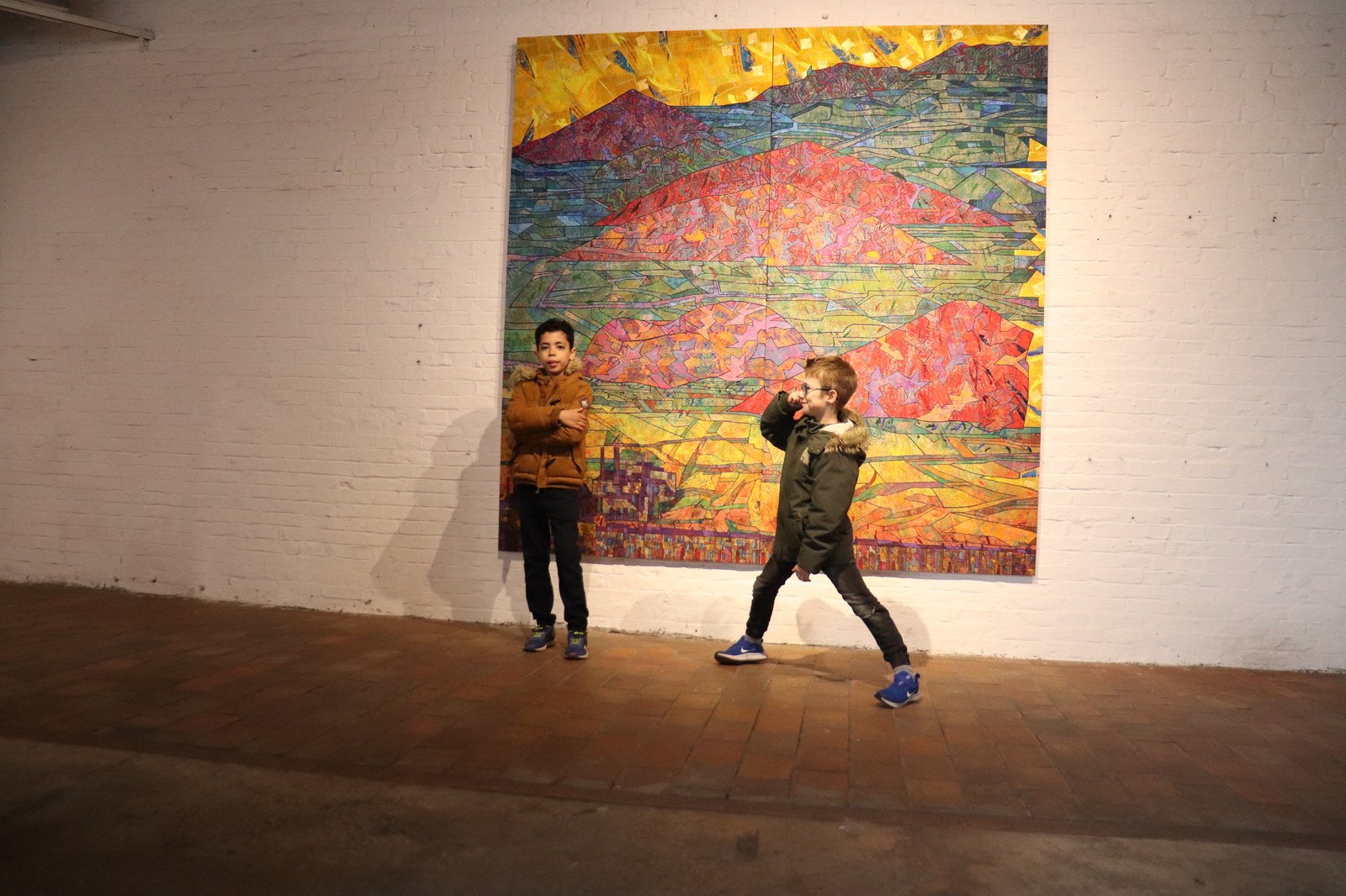 Le grand jour est arrivé : les enfants découvrent l’exposition de Daniel Pelletti. Un premier contact pour la plupart avec l’art ; la spontanéité est de mise en abordant les œuvres. Avant d’entrer quelques consignes s’imposent : sur le terril, on courait et on touchait tout ce qu’on voulait ; dans une exposition, on est calme, on se tient à distance des œuvres pour ne pas les abîmer. Deux univers complètement différents. Les enfants sont fiers : ils ont la chance de découvrir l’exposition en primeur, avant les journalistes et les autres visiteurs ! Ils ont également la chance de découvrir les coulisses du montage d’une exposition : les préparatifs ne sont pas encore tout à fait terminés.