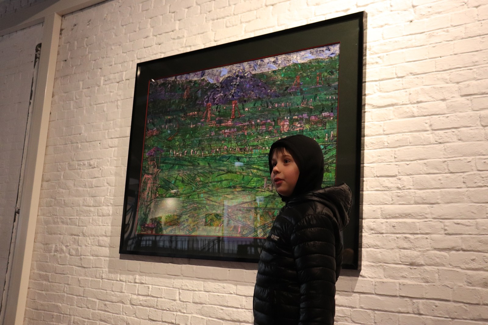Avant d’entrer, les enfants me montrent les dessins qu’ils ont fait du terril. Certains se veulent fidèles, d’autres ont déjà mis leur petit grain d’imagination et de réappropriation. Alparslan par exemple y a parsemé plusieurs formes géométriques, Philippe a représenté un terril d’autrefois mêlé à un terril d’aujourd’hui. L’idéal pour expliquer que l’artiste nous donne à voir sa propre vision du monde et non la réalité telle qu’on pourrait la voir sur des photos. Dès l’entrée, ce sont des yeux émerveillés par toutes ces couleurs qui jaillissent au premier regard. J’explique que Daniel Pelletti est le voisin de leur école, qu’il a grandi dans ce paysage et qu’il le réinterprète à sa façon.